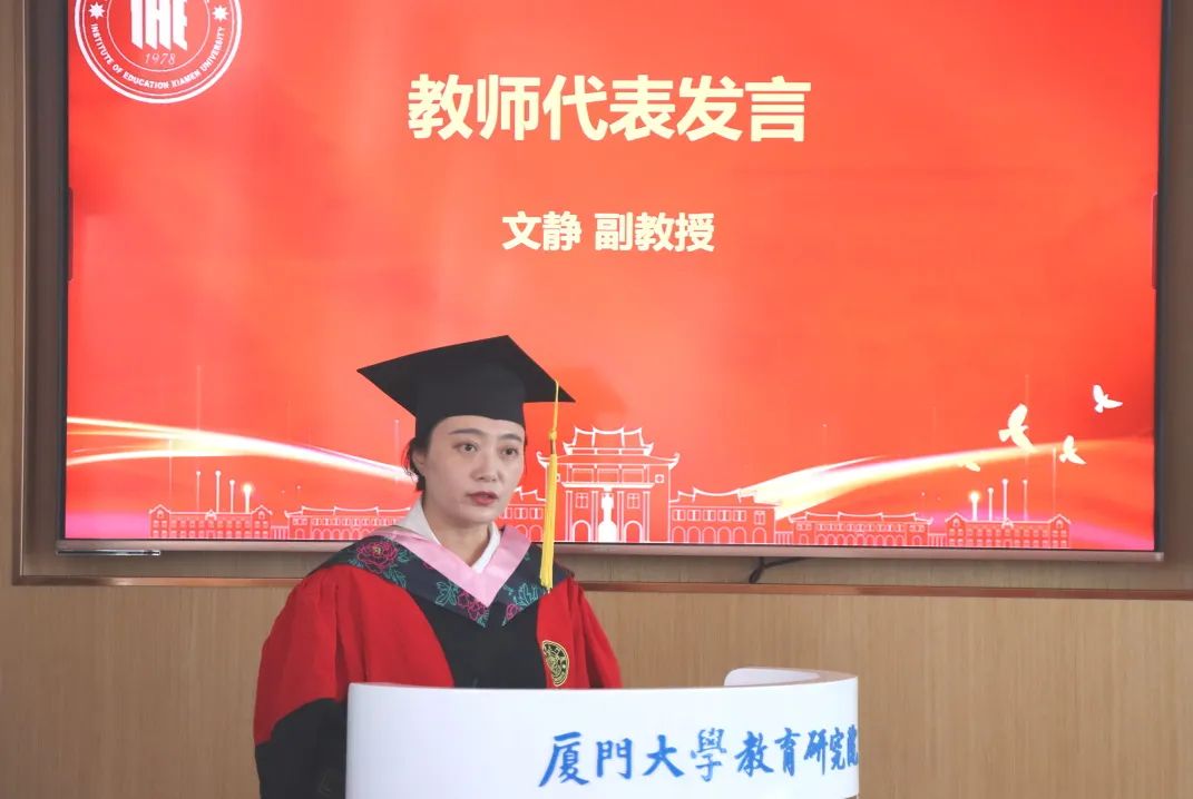 文静副教授作为导师代表发言,她强调,学术理想在于追寻,学生生涯在于体验。她鼓励毕业生们带着厦门大学高等教育发展研究中心的优秀基因踏上新征程,开启新篇章。