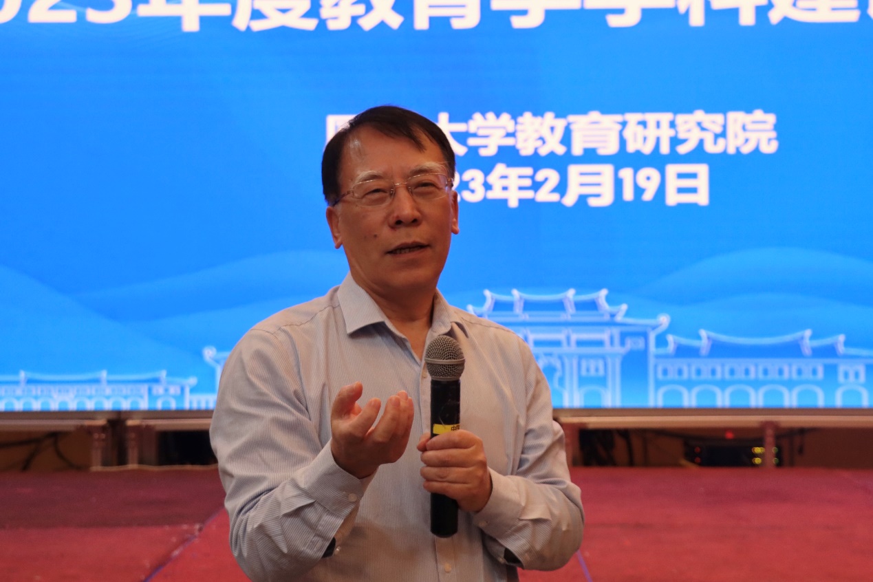 院长别敦荣教授在作教育研究院2022年工作总结时,高度肯定了全体教职工在教育学一流学科建设中所展现的凝聚力和创造力,并分析了未来发展面临的主要机遇、困难和挑战。他指出,青年教师是教育研究院发展的生力军,应当以昂扬饱满的精神积极参与一流学科建设,研究院将继续为他们的成长提供支持,营造优良的发展环境。