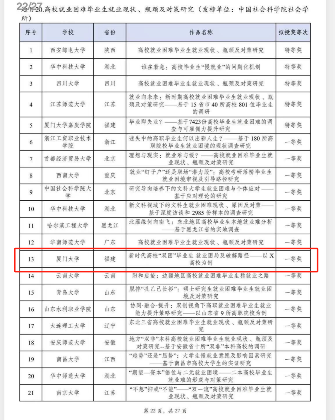 作为指导教师,我很高兴参与并见证了学生们在“挑战杯揭榜挂帅”专项赛中夺得了一等奖的全过程,这一成果的取得让我为他们深感骄傲。此荣誉不仅体现了学生们探索创新的能力,也展示了厦门大学高等教育发展研究中心作为国家一流学科培养高素质创新型研究生人才的成果。在开展“高校就业困难毕业生就业现状、瓶颈及对策研究 ”这一主题的研究时,学生们展现出了杰出的团队协作能力和专业素养。他们不仅能灵活运用高等教育学的理论和方法,还能跳出常规思维,结合社会学、心理学等跨学科知识,从多学科、多角度加以分析并提出解决策略,从而确保了研究的深度与创新性。