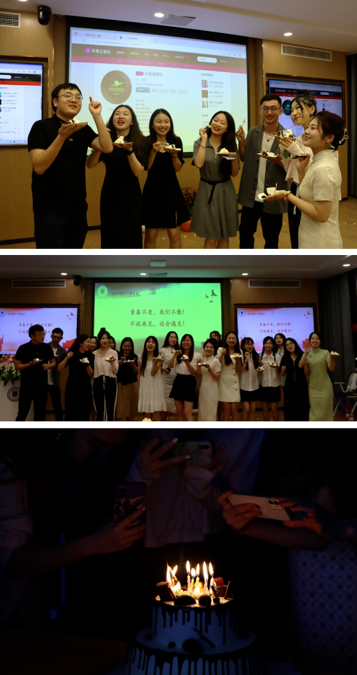 晚会的尾声,第18届团总支研究生会成员为全体毕业生带来了精心准备的歌曲《再见》,在不舍的歌声中,推出了为毕业生准备的惊喜——毕业纪念蛋糕。在歌声与欢笑声中,毕业生们合影留念,彼此祝福。