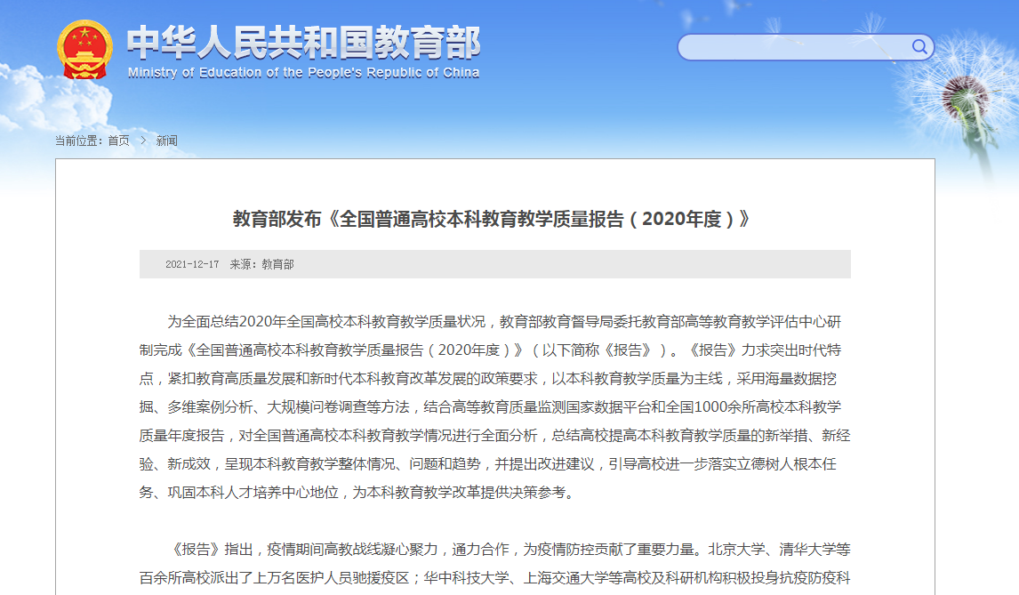 日前,教育部正式发布《全国普通高校本科教育教学质量报告(2020年度)》,引起社会广泛关注,央视新闻报道,各大主流网络平台和平面媒体转发。该报告由教育部教育督导局委托教育部高等教育教学评估中心研制,厦门大学高等教育发展研究中心专家组牵头,以“服务国家、建设一流”为宗旨,协同西安交通大学、同济大学等多家单位专家,在评估中心的领导和统筹下共同完成。